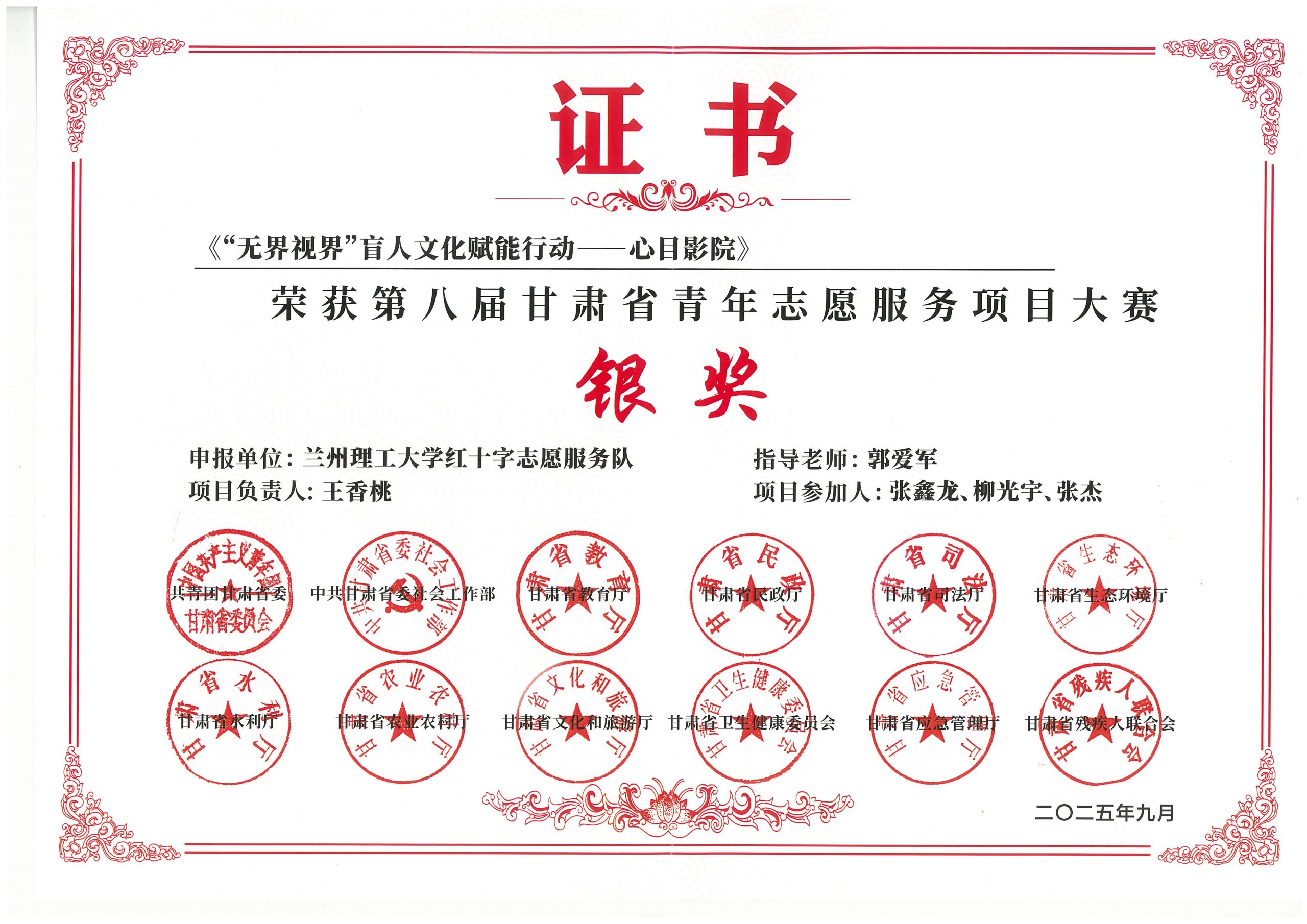 9月9日上午,由共青团甘肃省委及各相关厅局共同举办的第八届甘肃省青年志愿服务项目大赛在国网甘肃省电力科学研究院圆满落幕。自大赛启动以来,在校团委的认真指导和大力支持下,由我校郭爱军老师指导,王香桃同学负责的“无界视界”盲人文化赋能行动——心目影院项目,从全省583个参赛项目中脱颖而出,最终斩获银奖。