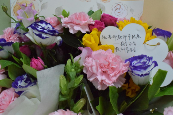 清晨微凉,情意暖融。学生代表们手捧精心准备的鲜花和写满祝福的卡片,早早等候在校车乘坐点、教学楼前、办公室走廊等处。“老师,您辛苦了!”“祝老师节日快乐!”伴随着一声声真挚的问候,一束束鲜花被送到正在奔赴工作岗位的老师们手中。灿烂的笑脸、温暖的祝福、热烈的互动,让整个校园洋溢着温馨与感动的氛围。