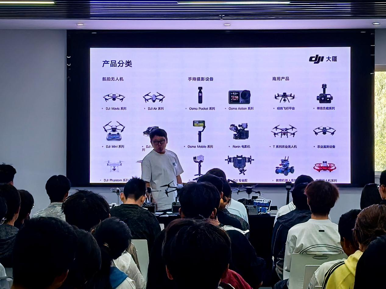 活动分为技术宣讲与实景体验两个环节。在技术宣讲环节,大疆官方认证讲师为同学们系统介绍了无人机技术的发展动态,通过航拍作品赏析和产品技术讲解,让师生深入了解无人机领域的技术突破和应用前景。随后进行了室外飞行体验环节,为同学们提供了亲自操作无人机设备的机会,通过理论与实践相结合的方式,增强了大家对无人机技术的了解和掌握。