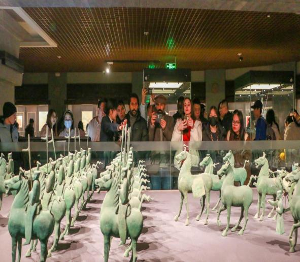 “丝绸之路文明”展厅内,铜奔马昂首嘶鸣的矫健身姿震撼人心。文学院学子张馨月驻足良久,并激动地说:“亲眼见到这些见证中华文明创造力与包容性的珍贵文物,才真正懂了习近平总书记说的‘以时代精神激活中华优秀传统文化的生命力’的深刻意蕴。毕业以后我要当好文化传播的桥梁,把蕴含中国智慧的丝路故事、中国故事讲给更多人听!”