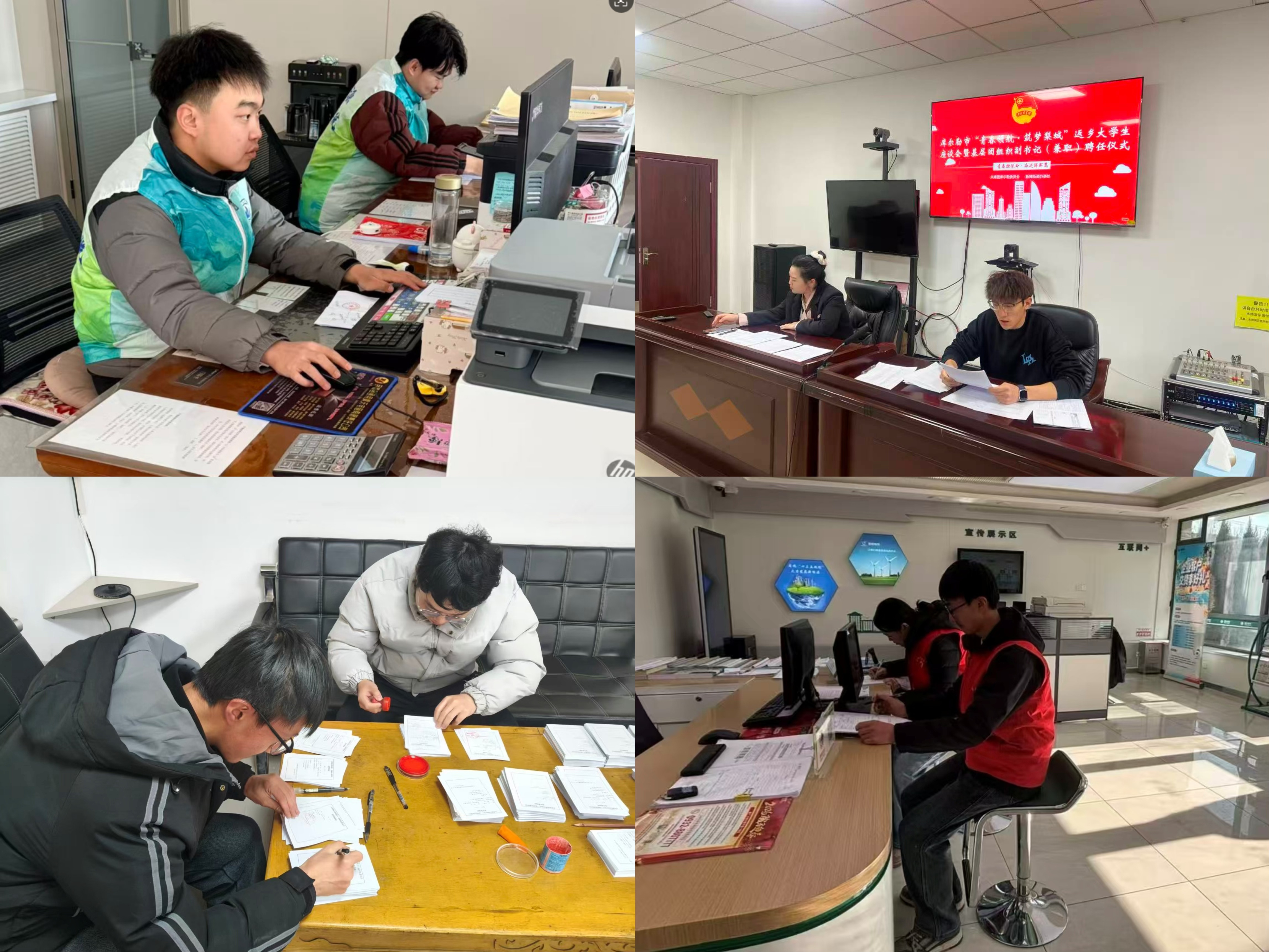 一是基层治理实践,赋能基层治理。来自各学院的青年学子走进家乡党政机关与乡镇社区,在政务岗位上接受沉浸式实践锻炼。绿储学院的“拾光筑梦实践队”赴民勤县养老院送慰问、做服务,获民勤共青团、武威团青等多个官方平台报道。计智学院的吕嘉瑞同学在凉州区法院执行局整理卷宗时,从最初的手忙脚乱到独立规范归档,在严谨文书中读懂“平凡之处见真章”。自动化学院的鲍华同学在平陆县圣人涧镇人大联络站参加村情民意座谈会,被“每一个字都是老百姓的期盼”深深触动。材料学院的侯博语同学从纠纷调解记录中体会到基层工作的温度与责任。机电学院的杨建辉同学用家乡话解读惠民政策,成为群众“贴心人”。经管学院的孙莹莹同学在家乡农投公司用镜头记录农产品“云端”之旅,助力直播销售。