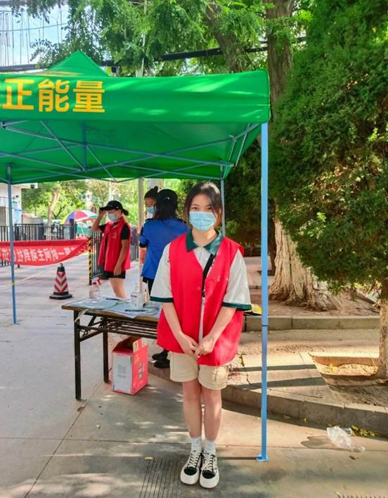 2021级网络空间安全一班本科生李婕雯同学参与到兰州市城关区拱星墩街道段家滩路西社区的疫情防控工作中。主要志愿工作为负责给其他志愿者工作拍摄照片,撰写相应报道稿来做好宣传工作。她说道:“虽然我的工作并没有一线志愿者那样艰辛,但我还是积极做好我自己的任务,每次收集其他志愿者的照片素材时,我看到了一线志愿者工作的辛苦,在炎热的天气下,裹着一层厚厚的防护服,我感受到作为一名志愿者,仅仅只有一腔热血是不够的,需要付出更多的心血与时间,需要饱含更强的意志力。”