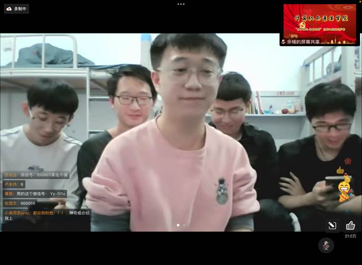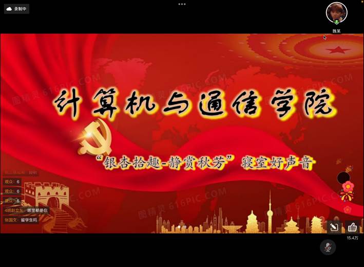 10月30日晚,计算机与通信学院团委组织开展了“银杏拾趣 静赏秋芳”之“寝室好声音”线上活动。“静默”在宿舍的同学除了做好自身防护、服从学校管理外,还用歌声、用才艺展示自己的青春风采,分享寝室生活、青春旋律,守护友情、传递真情、释放正能量,共同守护校园这片净土。尤其是22级新生积极踊跃参加,许多老师也被同学们精彩的表演所吸引。原定一个半小时的活动延长了一个多小时,同学们还意犹未尽。整个活动获点赞数45.2万,互动留言1.166万条,累计在线1000余人,包括其它学院、红柳艺术团等多名同学观看了活动。活动取得了圆满成功,收到了广大师生的一致广泛好评。