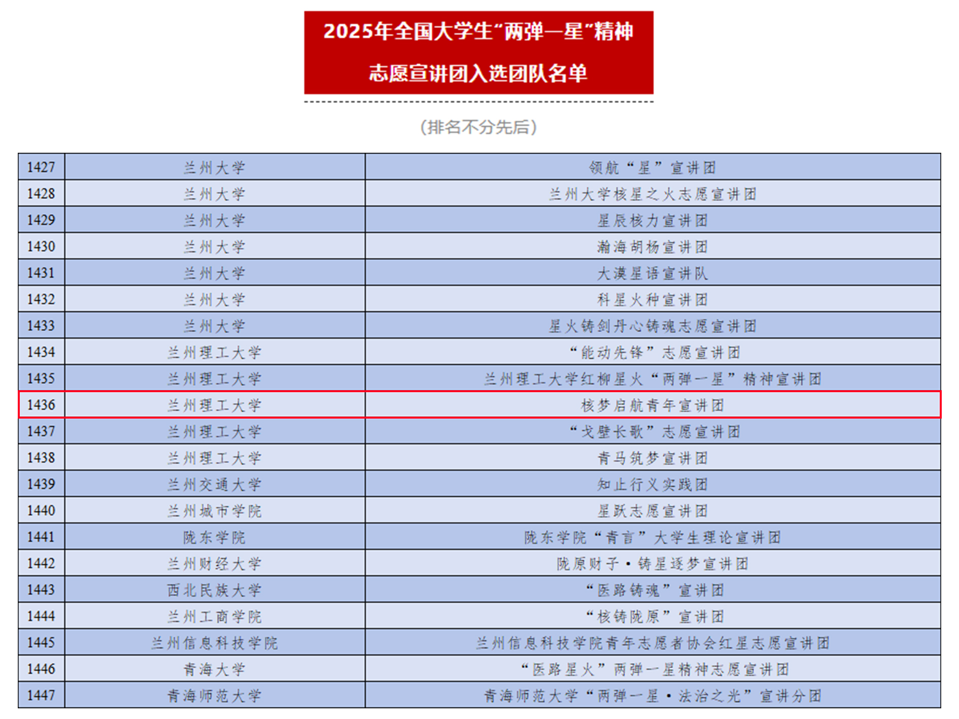 核梦启航青年宣讲团由兰州理工大学石油化工学院20名优秀红柳青年组成,涵盖油气储运工程、化学工程与工艺、过程装备与控制工程、安全工程、应用化学等核心专业。团队拥有8名中共党员和9名共青团员,成员均具有丰富的宣讲经验,形成了一支政治素养突出、实践能力扎实的先锋队伍。今年6月,团中央青年志愿者行动指导中心与中国核工业集团联合发起遴选全国大学生“两弹一星”精神志愿宣讲团,团队成功入选。
