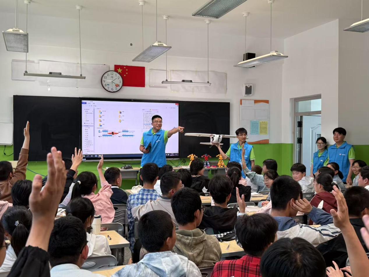 在互动环节,宣讲团成员们带来了航模飞机、四旋翼无人机和格斗机器人模型。“原来遥控飞行背后的原理是这样的!”、“机器人的搏斗是怎么实现的?”同学们围拢在模型前,志愿者们耐心解答同学们的问题,讲解模型的原理。“原来课本里的物理知识能这样应用到实际!”一位参与模型操作的同学兴奋地说。此次互动,是“两弹一星”精神的生动诠释,更在雪域少年的心中深深埋下了探索真理、勇攀科技高峰的火种。