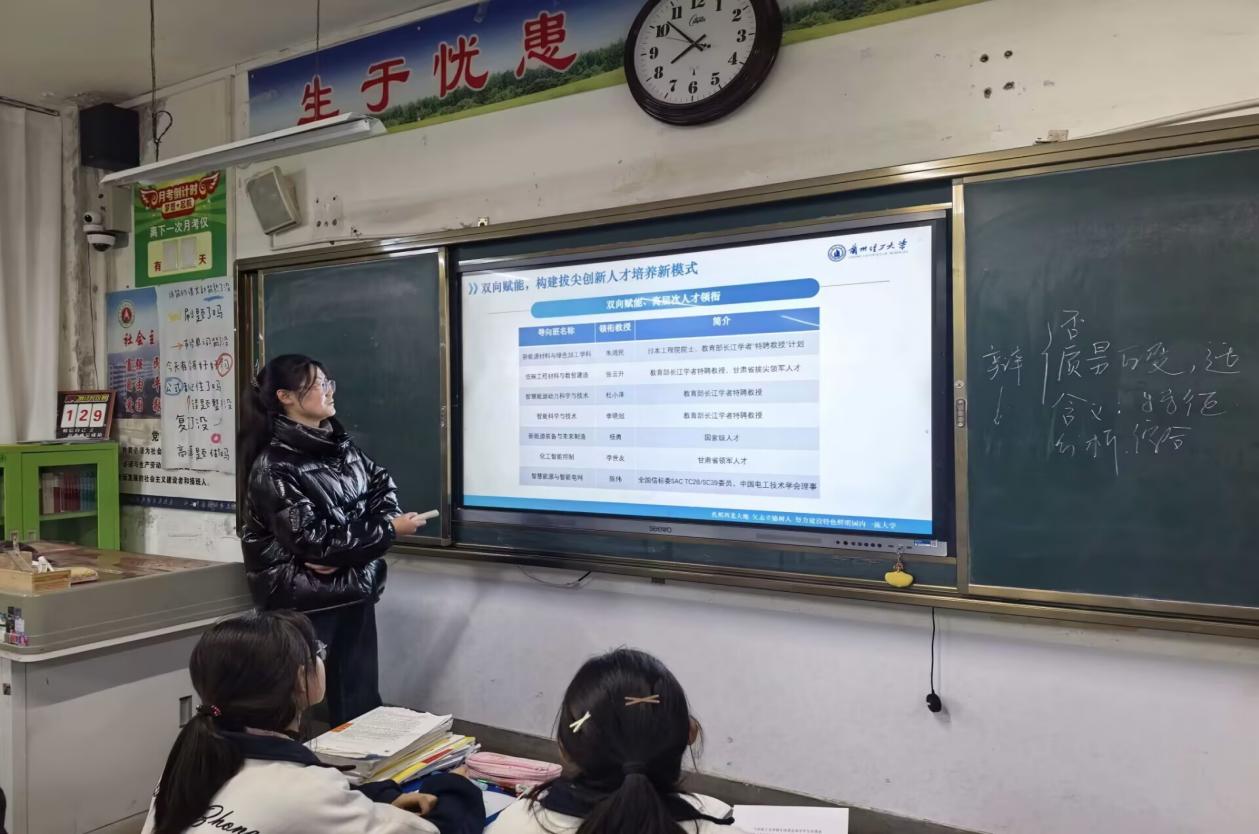 25级智能2班吕一立以“看见大学,遇见未来”为主题,为陕西师范大学平凉实验中学的学子带来精彩宣讲。他通过精心剪辑的视频,全方位展示兰州理工大学的实验室设施、校园风光与生活环境;同时梳理学校近三年录取数据,结合热门专业案例,指导学弟学妹根据自身成绩科学定位升学目标,让大家对大学有了更真切的认知。