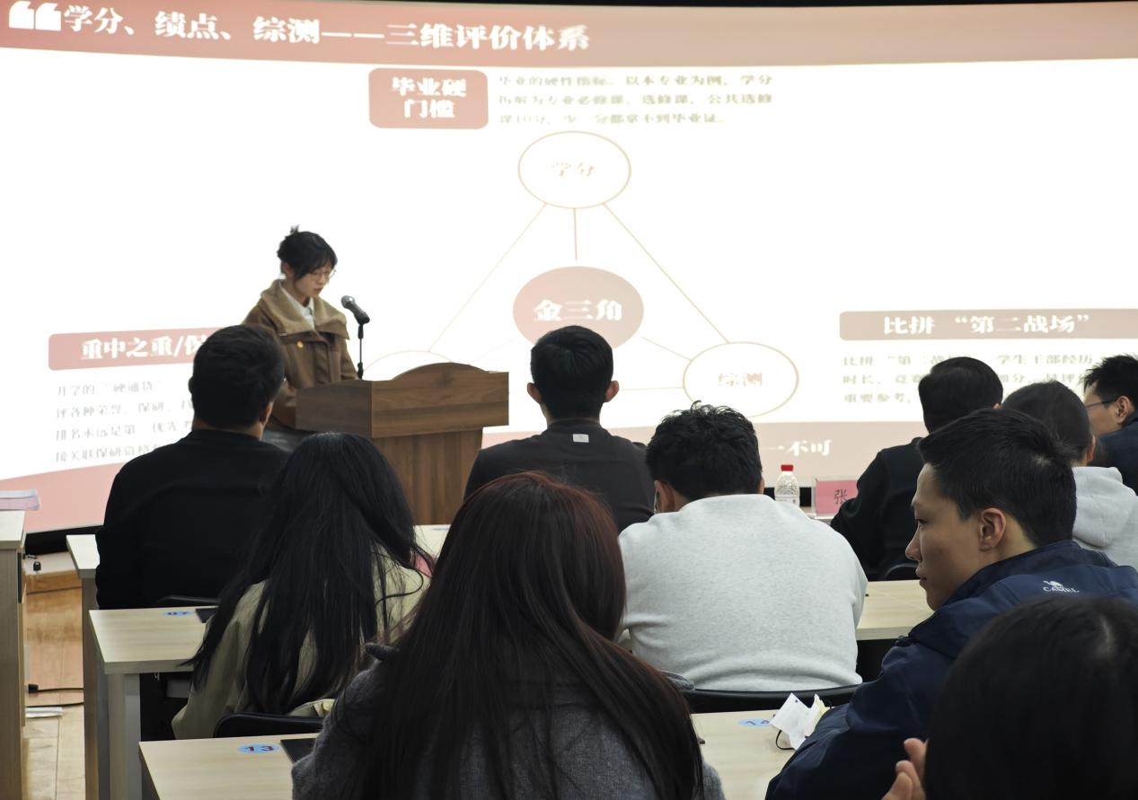科创竞赛达人、保研学子及学生社团骨干依次登台分享。他们立足自身成长轨迹,分别从科创项目实践、学科竞赛备赛、学业深耕方法、学生社团引领等角度,分享在科技创新道路上的参赛心得、挫折感悟与成长收获,用鲜活的案例为在场同学提供可学可鉴的科创思路与实践方法。