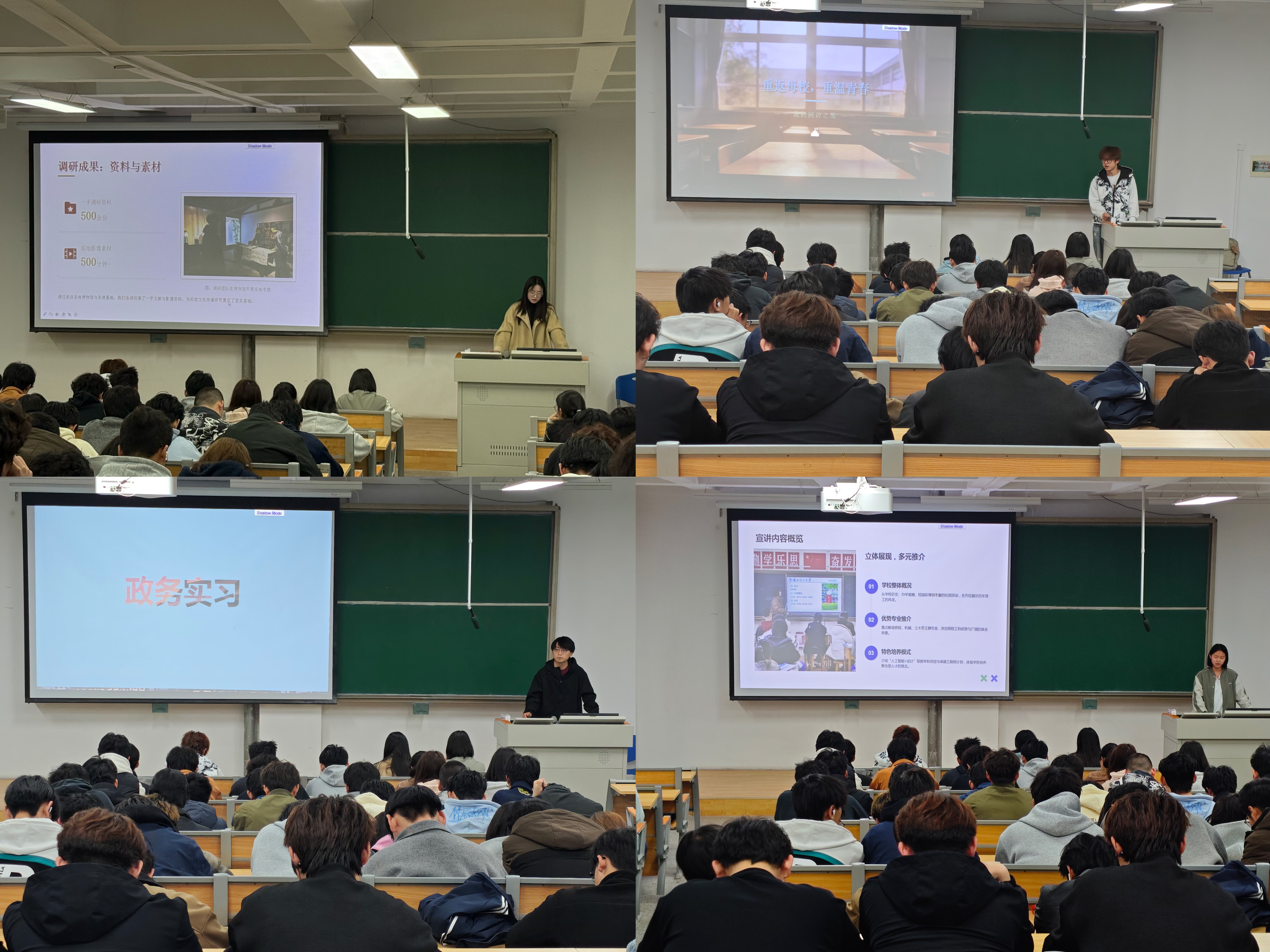 分享会上,各位同学通过PPT展示、视频播放等多样形式,生动还原实践过程中的所见所闻、所做所获,从不同实践领域出发,展现了青年学子的实干与担当。分享内容涉及政务实习、回访母校、探访革命旧址、优秀传统文化调研等内容。