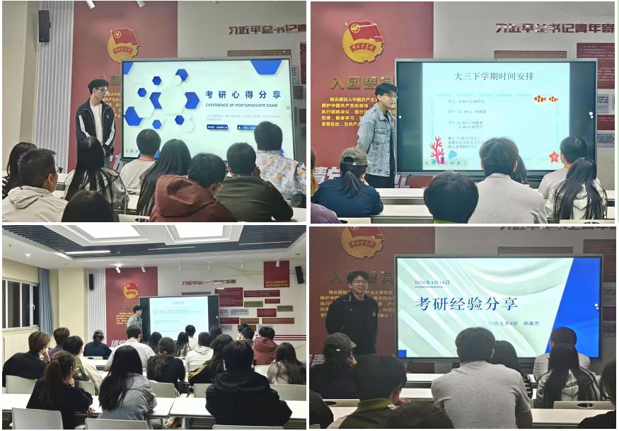 为进一步加强学风建设,充分发挥优秀学子朋辈示范引领作用,帮助低年级同学明确考研目标、掌握备考方法,4月14日,土木与水利工程学院举办“学风领航 研途筑梦——考研经验分享会”。