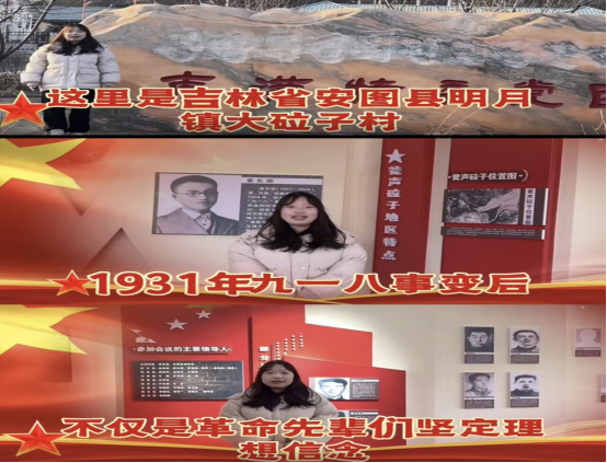 一批同学主动踏上红色热土,在历史现场接受精神洗礼。大数据专业马兰同学实地探访卫国戍边英雄事迹,深刻理解了红色基因传承的时代意义。2025级市场营销专业赵雪婷同学以“重走东满抗日策源地”为主题,通过实地探访、史料研读,系统梳理了瓮声砬子会议的历史价值,在先辈奋斗过的土地上厚植了爱国情怀。2025级国际经贸专业赵耀同学在准备董存瑞英雄事迹视频创作的过程中,通过交叉比对史料,锻炼了信息甄别能力,更被无畏的英雄气概深深震撼。
