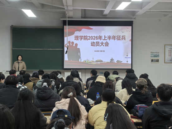 为积极响应国家征兵号召,激励大学生携笔从戎、报效祖国,理学院于11月27日下午在彭家坪校区观成楼206教室召开2026年上半年征兵动员大会。大会由理学院党委副书记黄莺主持,党委学生工作部征兵工作办公室主任唐洪川及兰州理工大学“最美退役大学生”苏博远受邀进行征兵政策专题宣讲,学院大三、大四全体学生参与。